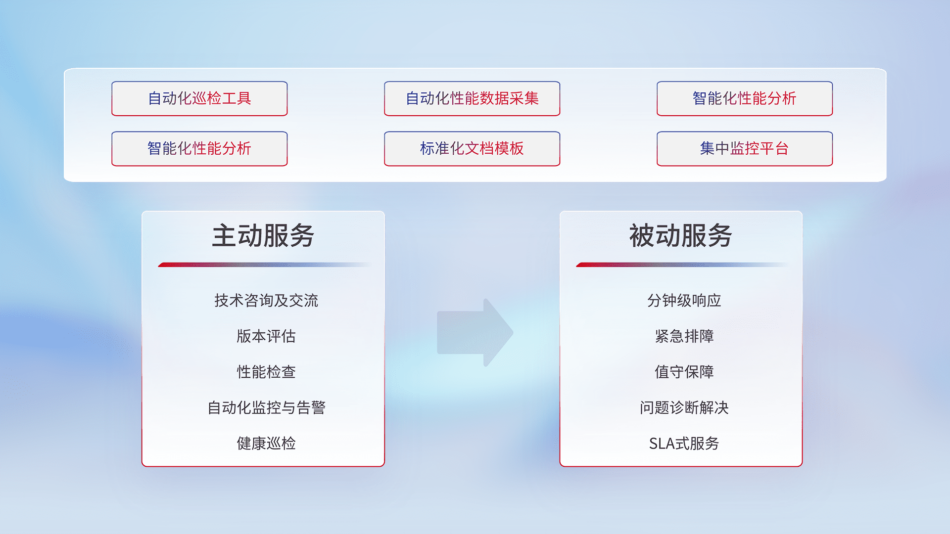 智能化工具和标准化文档,,,保障服务质量,,提供主动服务(包含技术咨询、、、版本评估、、、性能检查、、、自动化监控与告警、、健康巡检)和被动服务包含(分钟级响应、、、、紧急排障、、值守保障、、问题诊断解决、、SLA服务)。。